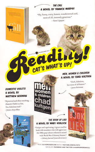 Para anunciar o lançamento de vários dos seus livros, a Harper Perennial decidiu juntar-lhes um animal que já se revelou um sucesso na Internet: o gato. Criou um anunciou original e que sobressaía dos seus pares, mas terá sido eficaz? O problema é que as pessoas mais depressa se lembram dos adoráveis gatos do que dos livros anunciados. Leia aqui.